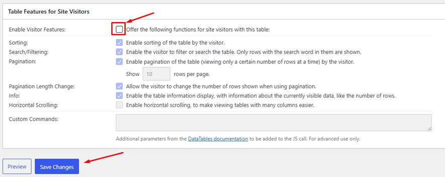 - Scroll to Table Features for site visitor and uncheck the enable visitor features